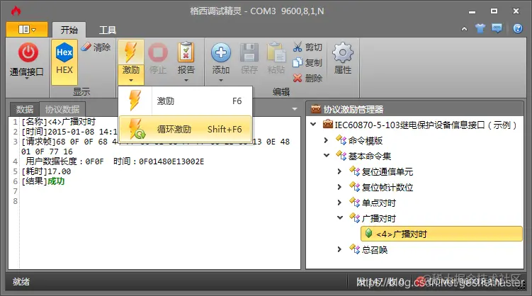 格西调试精灵软件支持单次测试和循环测试,能很好满足各种调试测试和性能测试的需求。执行的方法是选中需要测试的测试项或者测试集,然后执行激励或循环激励命令即可。
