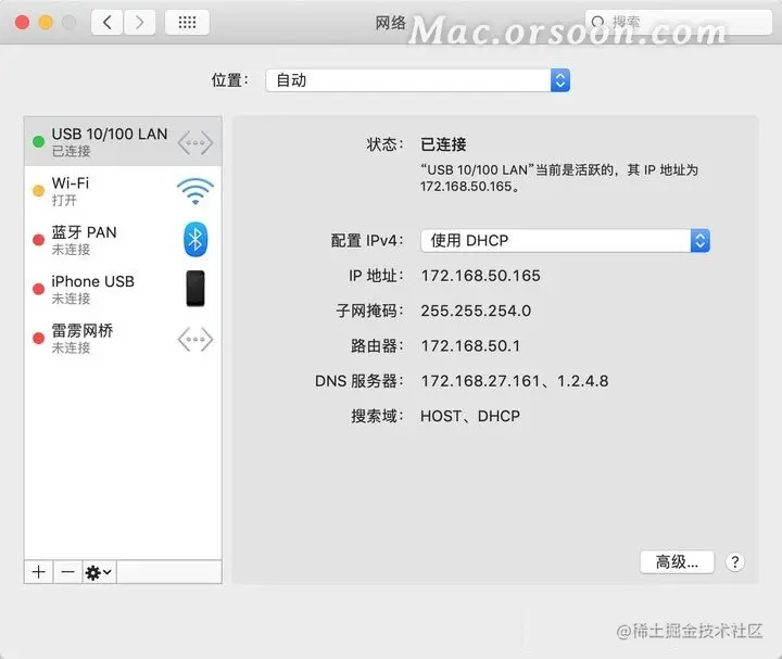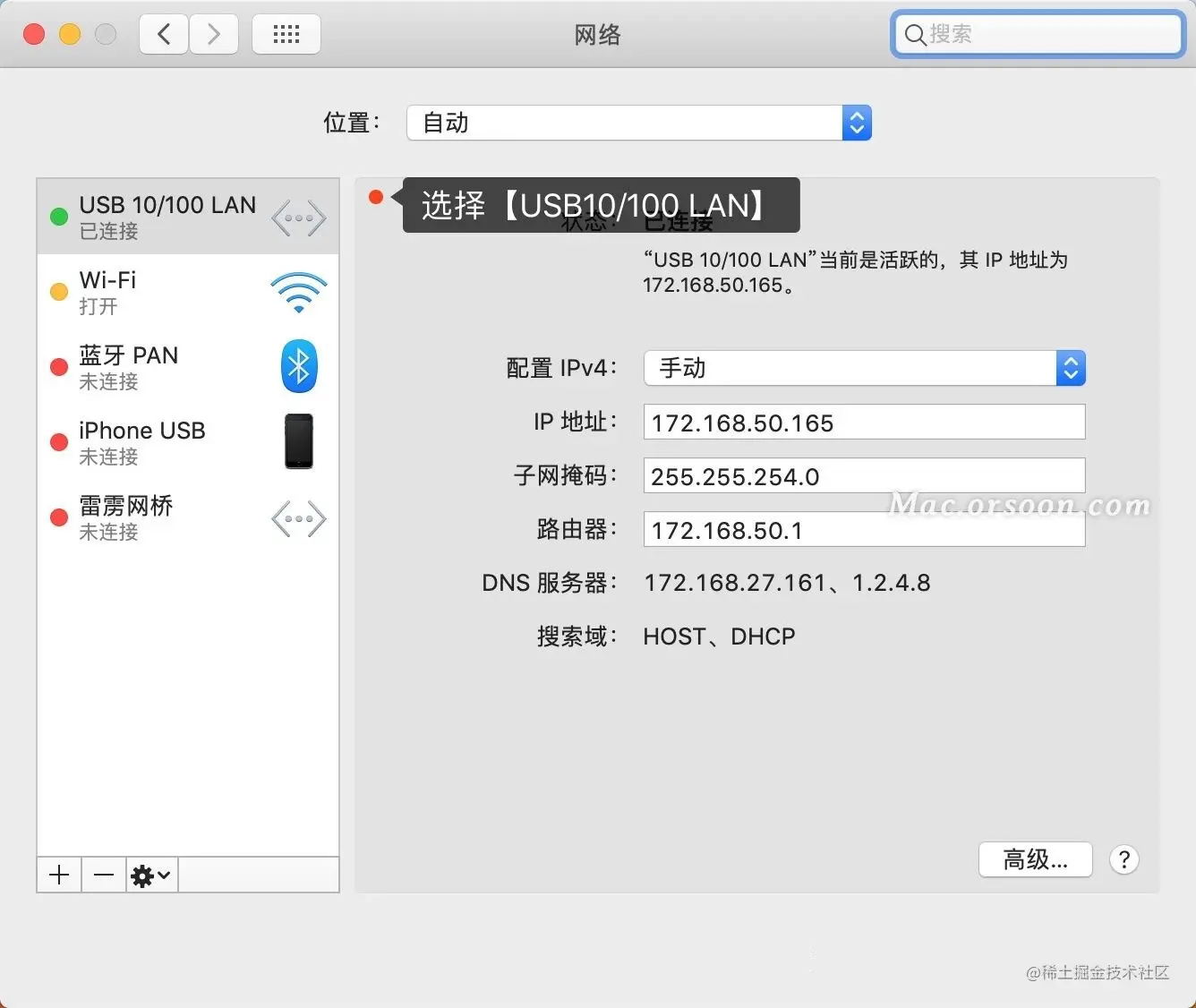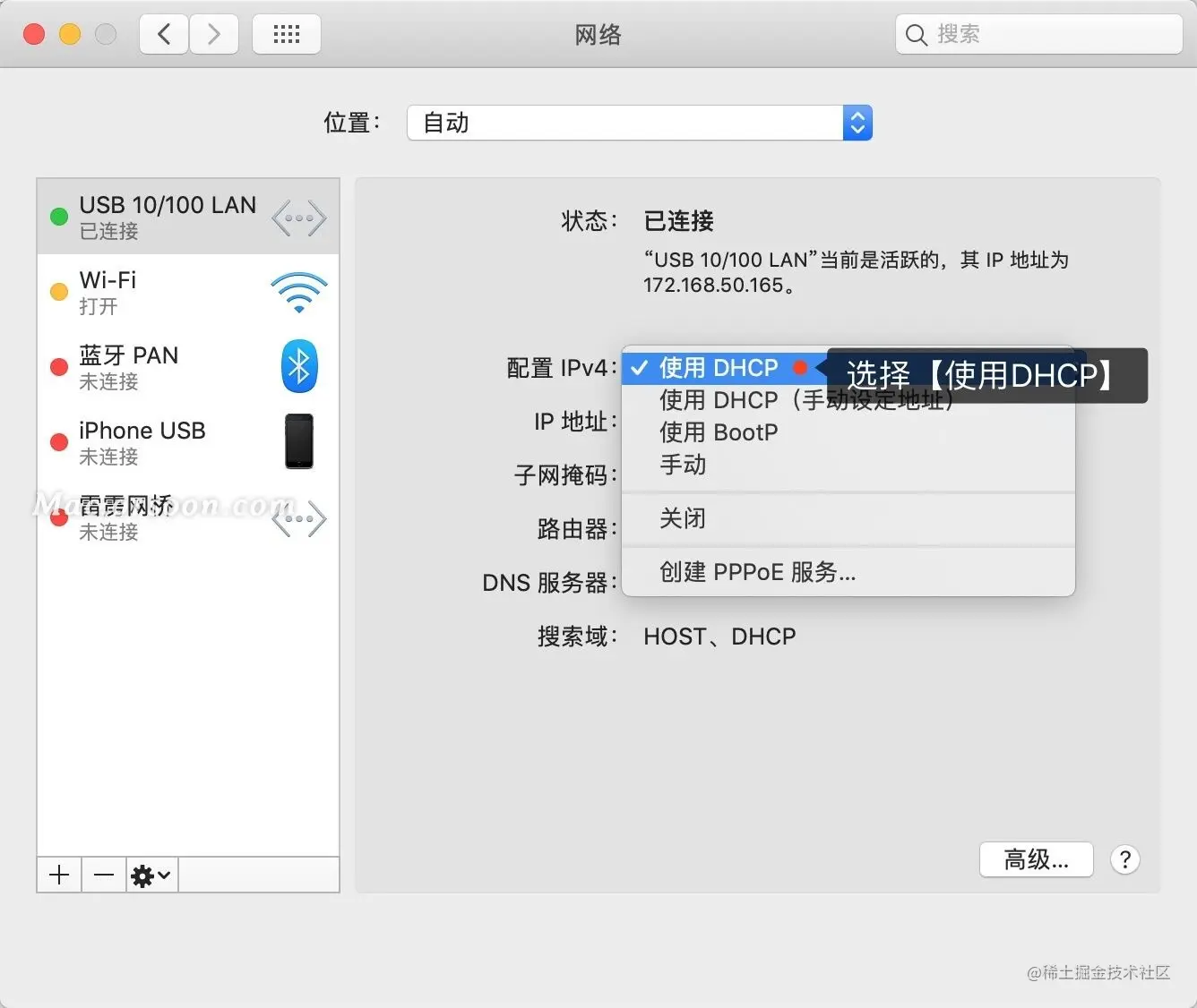 在只能通过网线上网的情况下如何让你Macbook连上互联网,除了需要转换器之外,在Mac上我们还需要配置DHCP或手动配置静态IP上网。