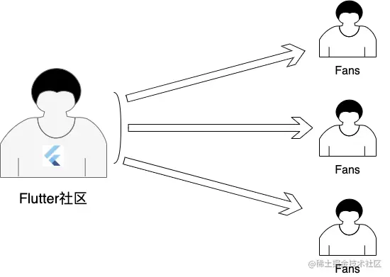 微信的公众号可以被视为生活中最典型的观察者模式的例子。如果你订阅了「Flutter社区」,每当 Flutter 社区发布文章时,就会给你及其他订阅者推送这个消息,这其中你就是 观察者,公众号「Flutter社区」就是 被观察者 (Observable) 或发布者 (Subject)。