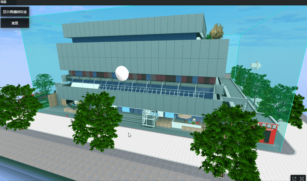 涉及到的剖切对象是要进行剖切的数字孪生可视化建筑,首先查询该建筑,设置建筑为不可拾取的状态,包括建筑内部楼层。开启剖切动作之后,建筑周围出现剖切包围盒,基于对象创建更多样式提高辨识度。
