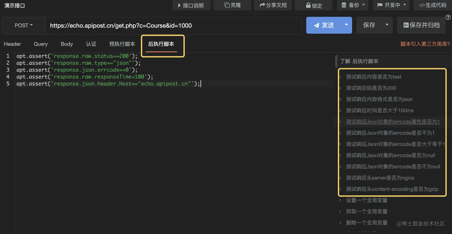 例:apt.assert('response.json.header.Host=="echo.apipost.cn"');