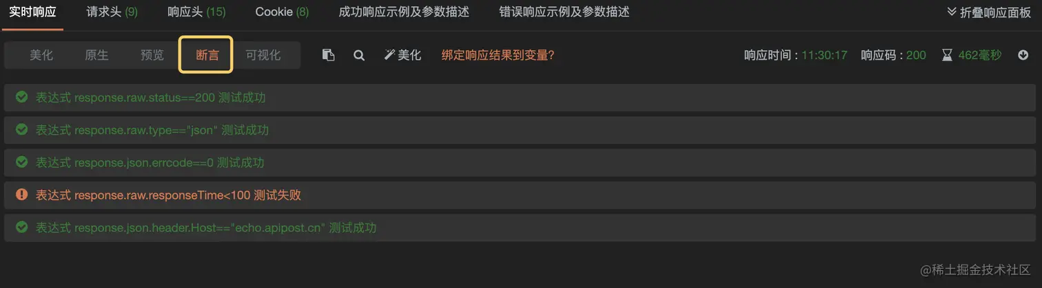 除了查看结果外,ApiPost也提供了强大的测试校验功能。在这里我们也可以使用断言来进行响应结果的校验。