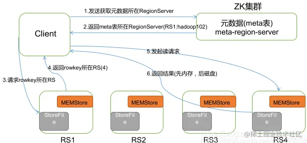 1)Client 先访问 zookeeper,从 meta 表读取 region 的位置,然后读取 meta 表中的数据。meta中又存储了用户表的 region 信息;