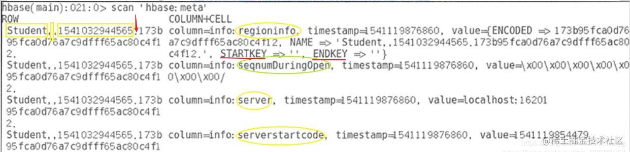 Meta 表中的每一行记录了一个 Region 的信息。RowKey 包含表名、起始行键和时间戳信息,中间用逗号隔开,第一个 Region 的起始行键为空。时间戳之后用.隔开的为分区名称的编码字符串,该信息是由前面的表名、起始行键和时间戳进行字符串编码后形成的。