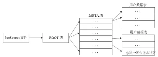 根数据表,又名-ROOT-表,记录所有元数据的具体位置,-ROOT-表只有唯一一个Region,名字是在程序中被写死的。Zookeeper文件记录了-ROOT-表的位置
