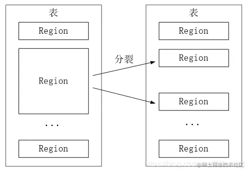 开始只有一个Region,后台不断分裂。Region拆分操作非常快,接近瞬间,因为拆分之后Region读取的仍然是原存储文件,直到“合并”过程把存储文件异步地写到独立的文件之后,才会读取新文件。