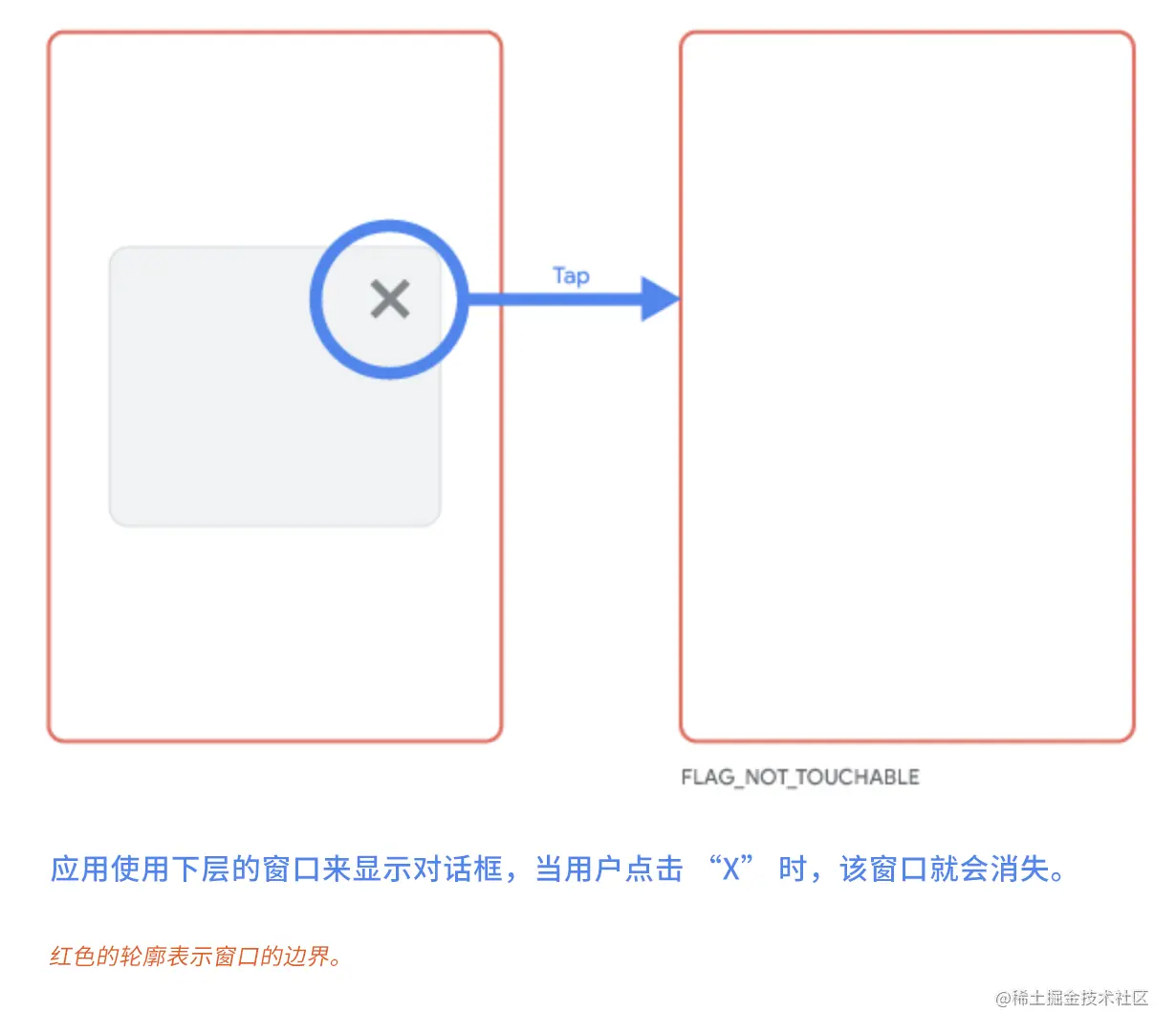 请注意,在以前的操作系统版本中,通过实际的 UI 元素进行的触摸事件,在这种情况下会传递到下层的窗口中。在这种情况下,首先请查看一下 Toast API 是否能满足需求,不行的话,解决方案也很简单——在右侧的图片有说明: 您只需要将窗口的边界缩小到实际的 UI 大小,并使用 FLAG_NOT_TOUCH_MODAL,有时您也可能需要删除 FLAG_NOT_TOUCHABLE。