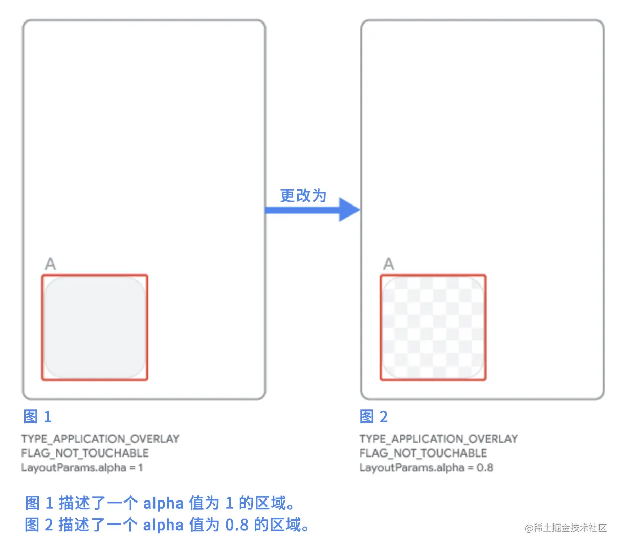 您必须在 窗口级别 上降低不透明度,仅仅改变视图的不透明度是不行的。您可以使用 LayoutParams.alpha 来降低不透明度,使其低于或者等于 InputManager.getMaximumObscuringOpacityForTouch() 的值,如右边的图片所示。这个值目前是 0.8,但是在 Android 12 最终版本发布前可能会改变。