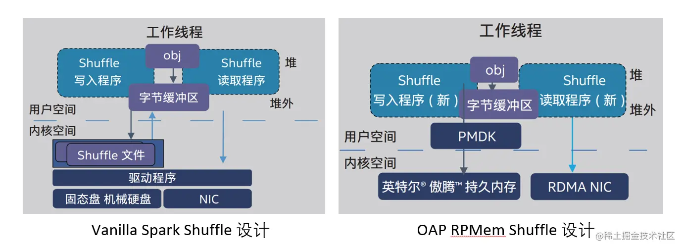 在 Vanilla Spark Shuffle 设计中,需要首先将数据序列化到堆外内存,然后写入机械硬盘或固态盘上的本地文件系统,并最终通过 TCP-IP 网络传输数据。这一过程涉及大量上下文切换和文件系统开销,因此如果不对现在的 Spark shuffle 实现进行更改,就无法充分利用英特尔® 傲腾™ 持久内存的能力。