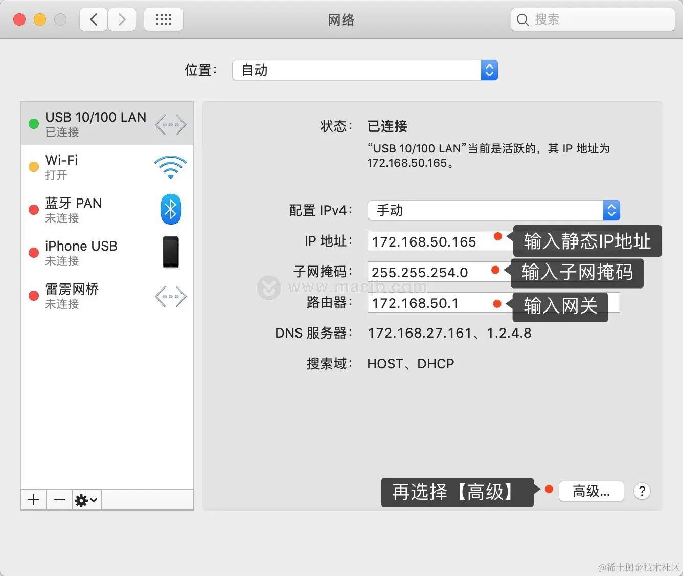 在只能通过网线上网的情况下如何让你Macbook连上互联网,除了需要转换器之外,在Mac上我们还需要配置DHCP或手动配置静态IP上网。