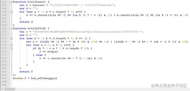 可以很清楚的看到,【window.f】出现了,通过调用hex_md5()来实现赋值;但是又出现了一个新的问题,【mwqqppz】是什么呢?