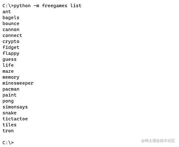 安装完之后我们可以使用 python -m freegames list 来查看所有的游戏列表