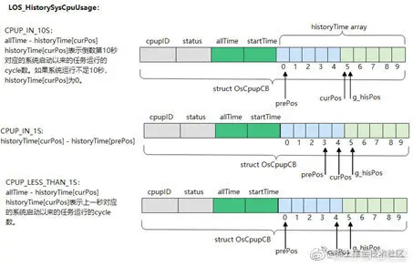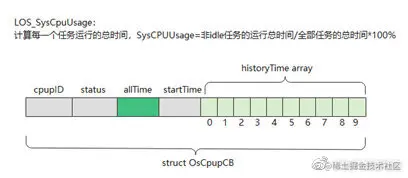 在文件components\cpup\los_cpup.h定义的CPUP控制块结构体为OsCpupCB,结构体源代码如下,allTime记录该任务自系统启动以来运行的cycle数,startTime记录任务开始运行的时间,historyTime[]历史运行时间数组的10个元素记录最近10秒中每一秒中每个任务自系统启动以来运行的cycle数,其他结构体成员的解释见注释部分。