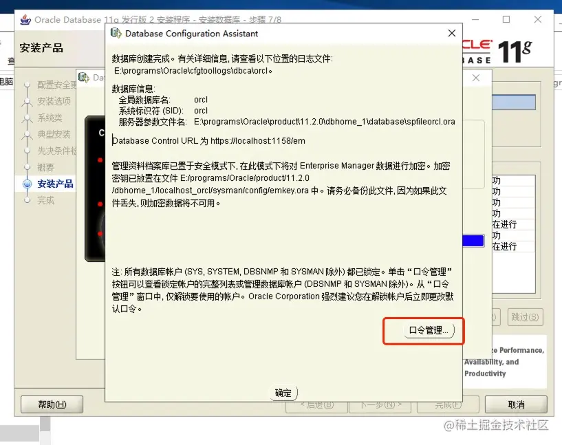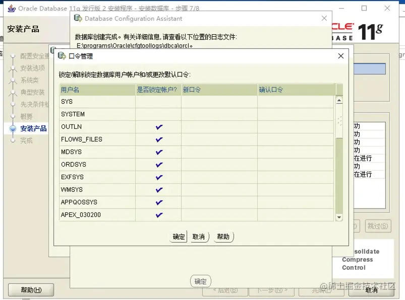 Oracle实例创建成功之后,会弹出如图1-1-14所示的界面,这里我们点击“口令管理”,对系统自带的部分账户进行解锁操作,我们只需要将解锁账户的对号去掉即可,如图1-1-15所示: