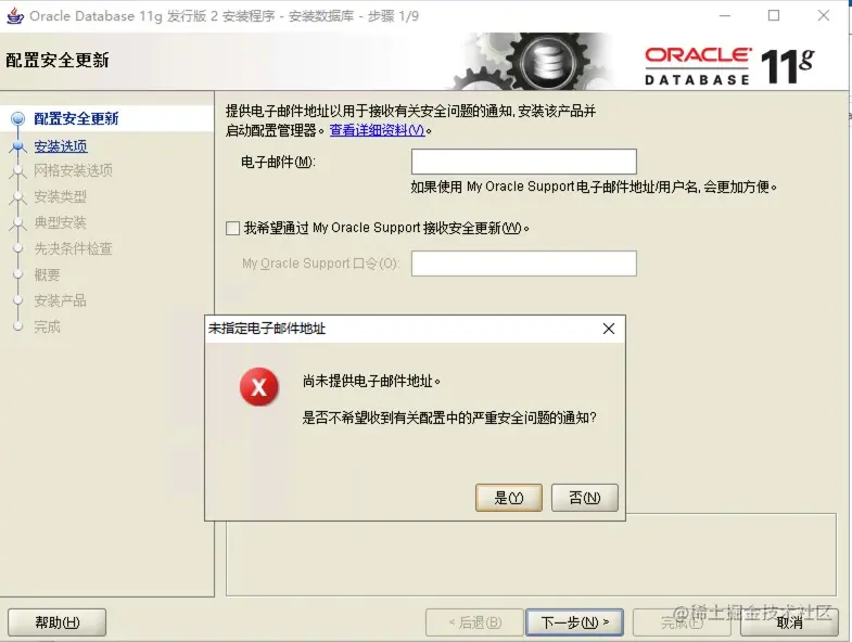 电子邮件不需要填写,取消“我希望通过 My Oracle Support 接收安全更新(W)”的勾选,直接点击下一步即可,这里会提示你,尚未提供电子邮件,我们不需要理睬,直接点击“是”,进入到下一步安装,如图1-1-6所示。