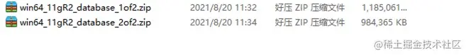 我们可以直接百度找到 ORACLE 官网,然后在官网进行下载自己所需要的版本,然后这里要说明的一点是,Oracle分成了两个文件,如图1-1-1所示。
