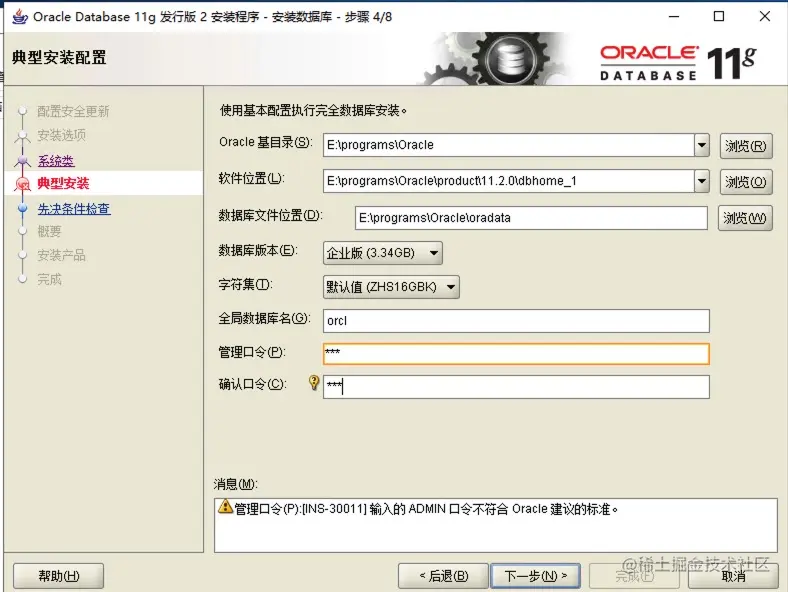 在这里我们需要配置Oracle的安装路径以及数据库名称和密码,如果设置的密码过于简单,会提示你密码不合符标准,这里我们可以将密码设置复杂一些,或者直接点击“下一步”进行继续安装,如图1-1-9所示: