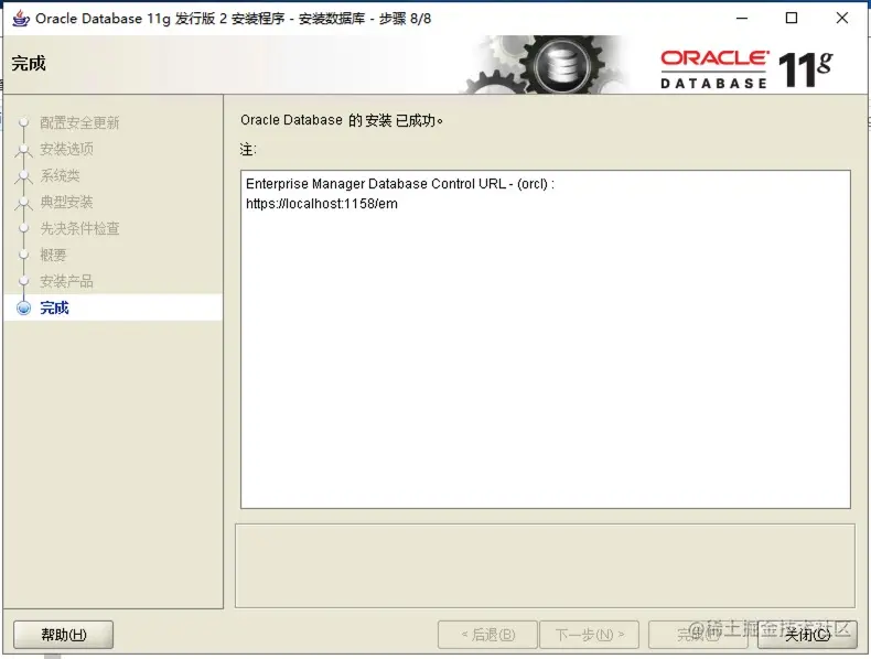 最后我们点击“关闭”按钮,完成Oracle的安装,如图1-1-16所示: