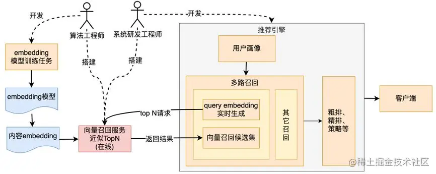 如果我们基于图3,来看向量召回服务的接入过程,将会得到图4的结果。算法工程师将基于业务特点,进行算法编写并产出embedding,同时,系统研发工程师和算法工程师将协作搭建起在线的向量召回服务,供推荐引擎调用,推荐引擎负责线上所有用户的推荐,其对性能的要求是非常高的,因此向量召回服务的性能也极其重要。对于不同业务而言,**如果向量召回服务没有通用化与服务化,则不同业务的算法与系统开发工程师各自需要重复搭建,且需要自行进行服务运维,**这无疑是增加了推荐开发工程师的负担,也是对开发效率的损耗。