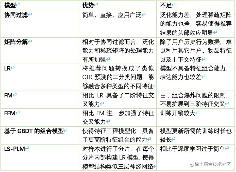 对于召回而言,有不少耳熟能详的方法,常见模型对比如下。