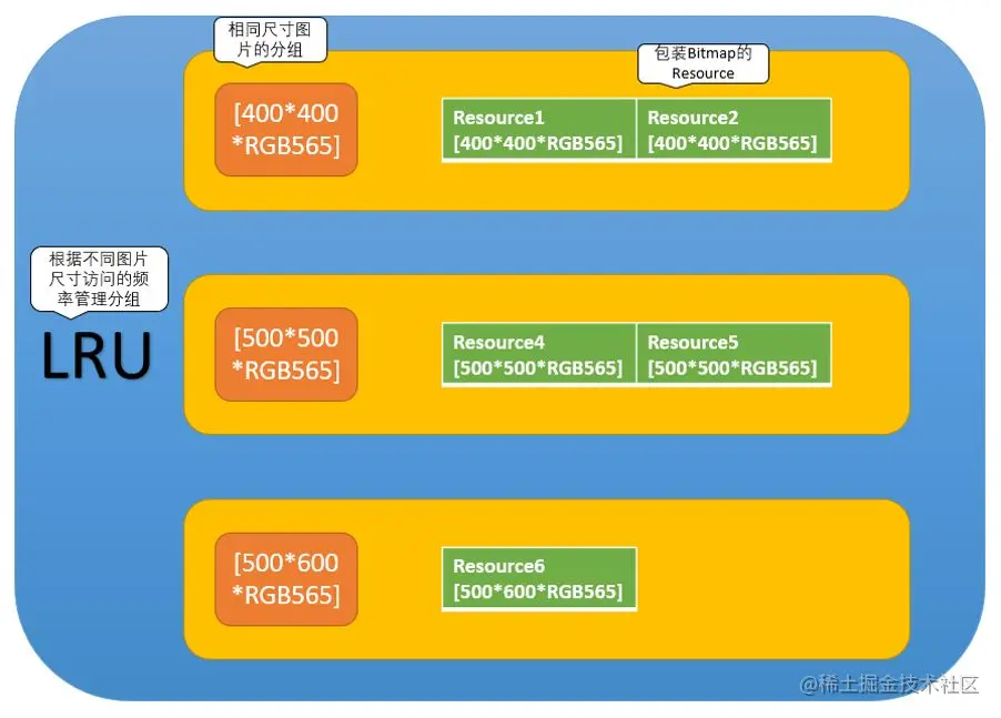 如上图,将图片资源按照尺寸信息进行分组,分组根据不同图片尺寸的访问频率,按照LRU的策略进行管理,这样可保证,InBitmapPool中存储的都是最近常用尺寸的图片资源,淘汰掉的是不常用尺寸的图片,当从InBitmapPool中查找符合尺寸要求的图片资源时,大概率可以找到。