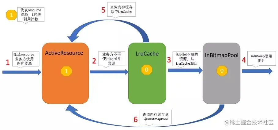 (7)(补充)加载一个业务方正在使用着的图片,**会命中ActiveResource,从ActiveResource中查询到对应的Resource之后,将Resource内部的引用计数+1,并返回给业务方使用。**举例:view1 加载 A Bitmap,加载成功之后缓存到了ActiveResource中,view2马上也加载A Bitmap,此时,会从ActiveResource中取出A Bitmap对应的资源,并计数+1,此时计数为2(view1 view2都在引用)。当view 1、view2都不再使用此图片,分别调用资源回收的方法,会分别将资源引用计数-1,当计数为0,A Bitmap对应资源会从ActiveResource中移除,添加到LruCache中。