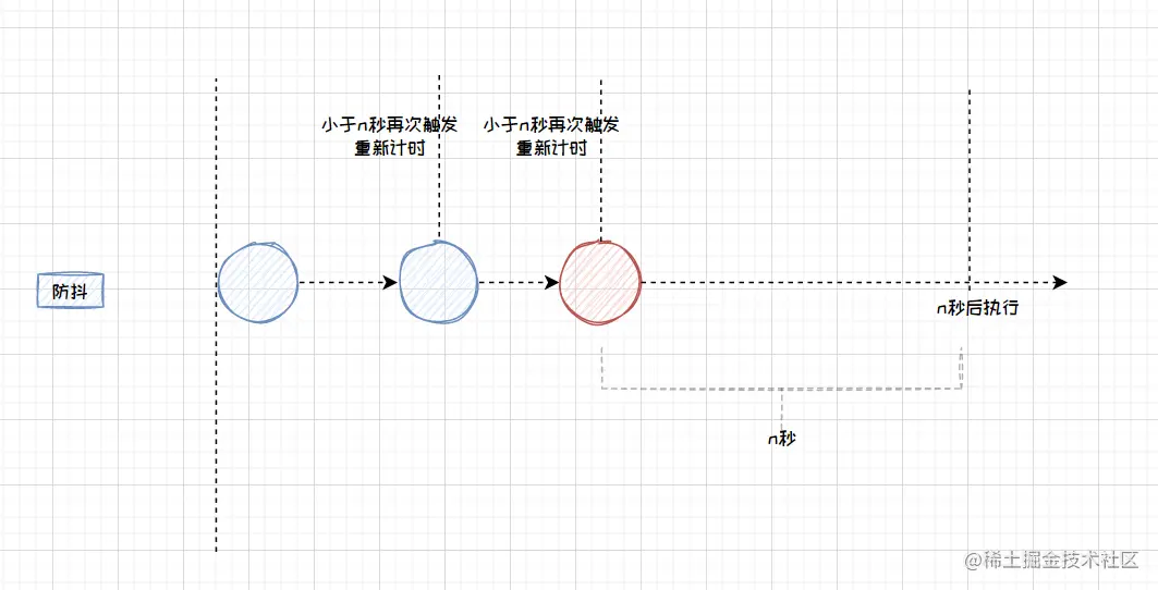 所谓防抖,就是在事件触发后延迟n秒再执行;如果在这n秒内再次触发该事件,则重新计时,延迟n秒后再执行。