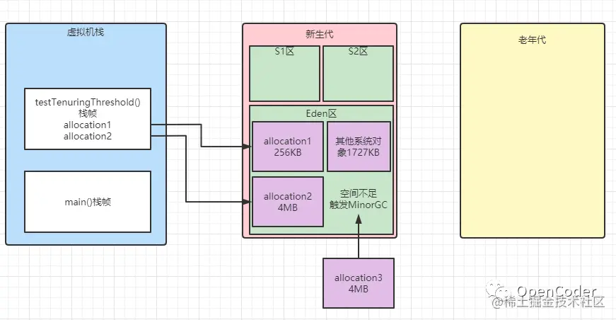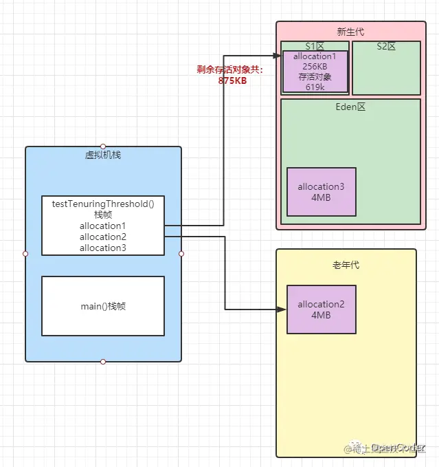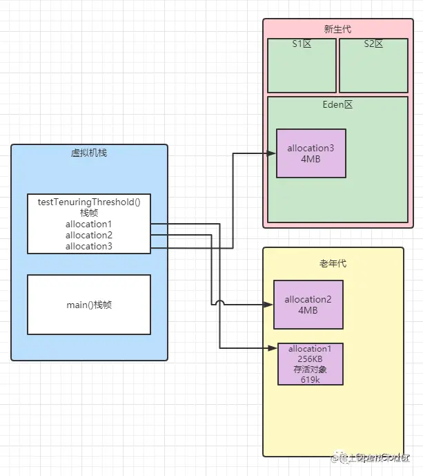 - 注意:新生代直接减少到了0!代表所有幸存区S1里的对象全部转移到了老年代!(因为我们的年龄阈值设置的刚好就是1)allocation3对象是直接被回收了