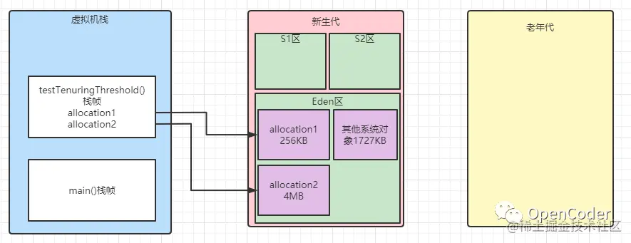 针对输出结果我们可以拆分来看,当allocation1和allocation2对象加载的时候,两个对象加在一起是4.25MB,Eden区都能存放下(Eden区大小9216K),没有任何问题,内存图如下: