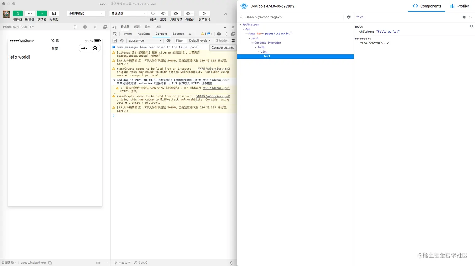 自 Taro 3.x 改造为运行时框架后,有不少同学抱怨小程序开发者工具的 AppData 面板看到的都是 Taro 虚拟 DOM 的序列化结果,而不是页面的 data 数据。为了缓解这个问题,并进一步地提升开发者的开发体验,Taro 对 React DevTools 和 Vue DevTools 进行了适配。只需要简单地配置,就能够和开发 Web 应用时一样使用框架的 DevTools。