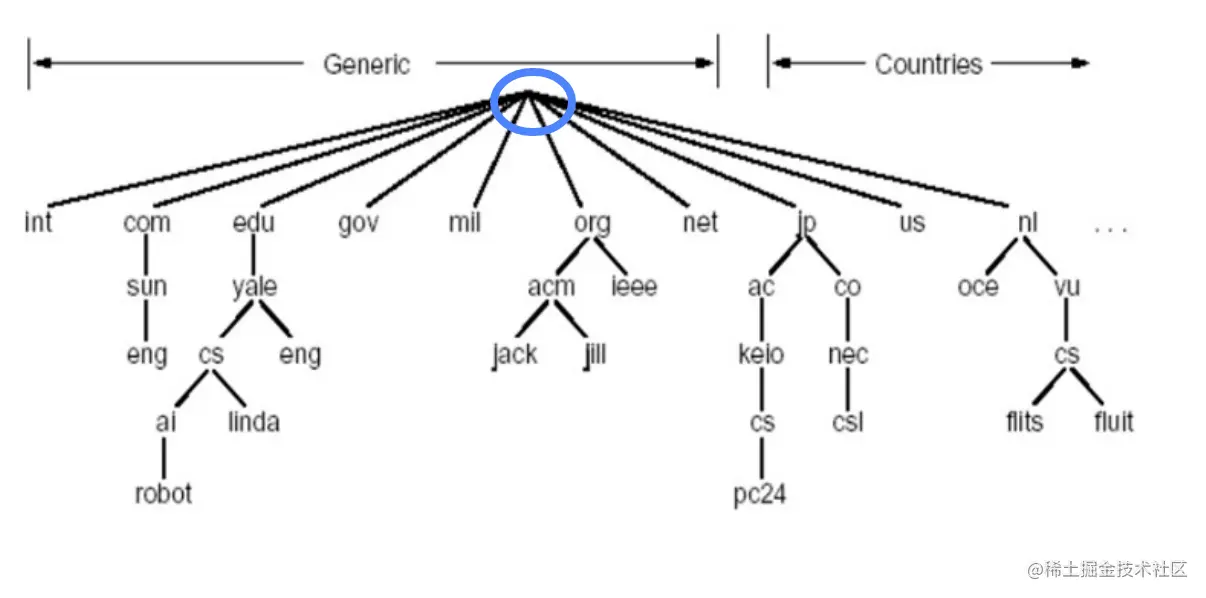 在图中我们可以看出,一开始整个的名字空间缩成一个点,后来被分解成几百个顶级域。顶级域分为两类,一个是通用的,比如 .com 。一个是国家的,比如 .cn。