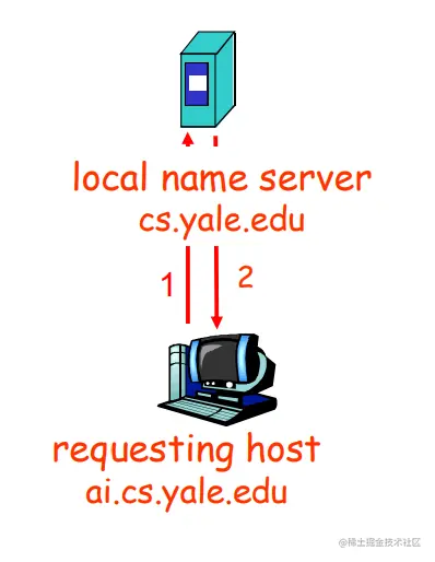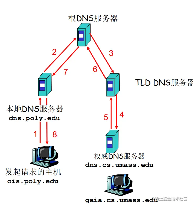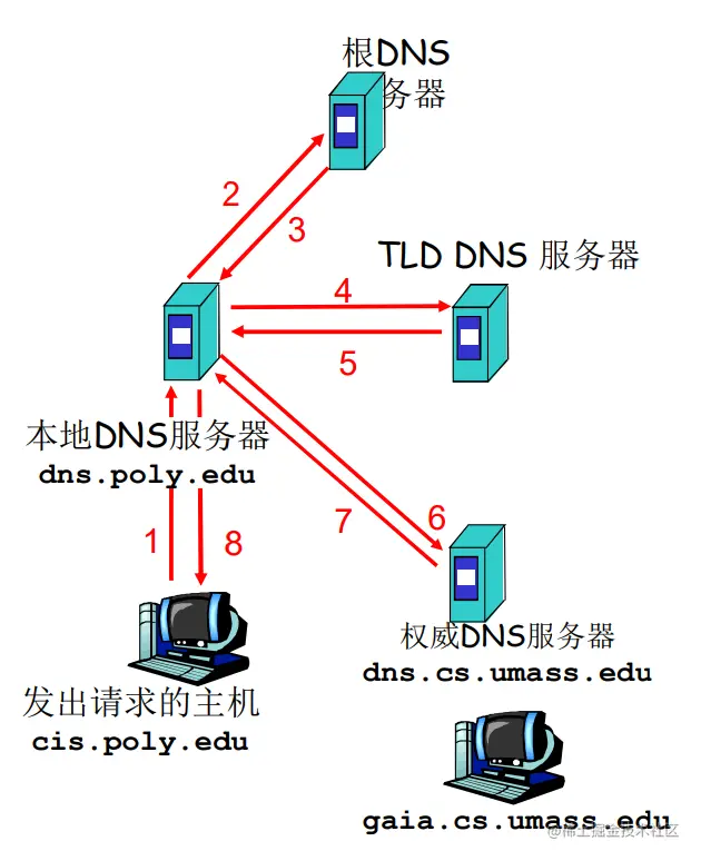 主机 cis.poly.edu 想知道主机 gaia.cs.umass.edu 的 IP 地址,它向本地 DNS 服务器发出询问。