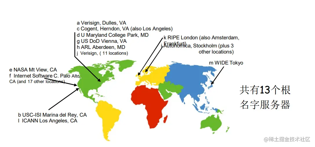 当然不是,因为如果只有一个根,它宕机了,整个互联网的查询也就出现了问题。所以现存的根有 13 个,大部分运行在北美,欧洲,日本也有。查询的时候,必须要从 13 个树根当中的任何一个往下找。