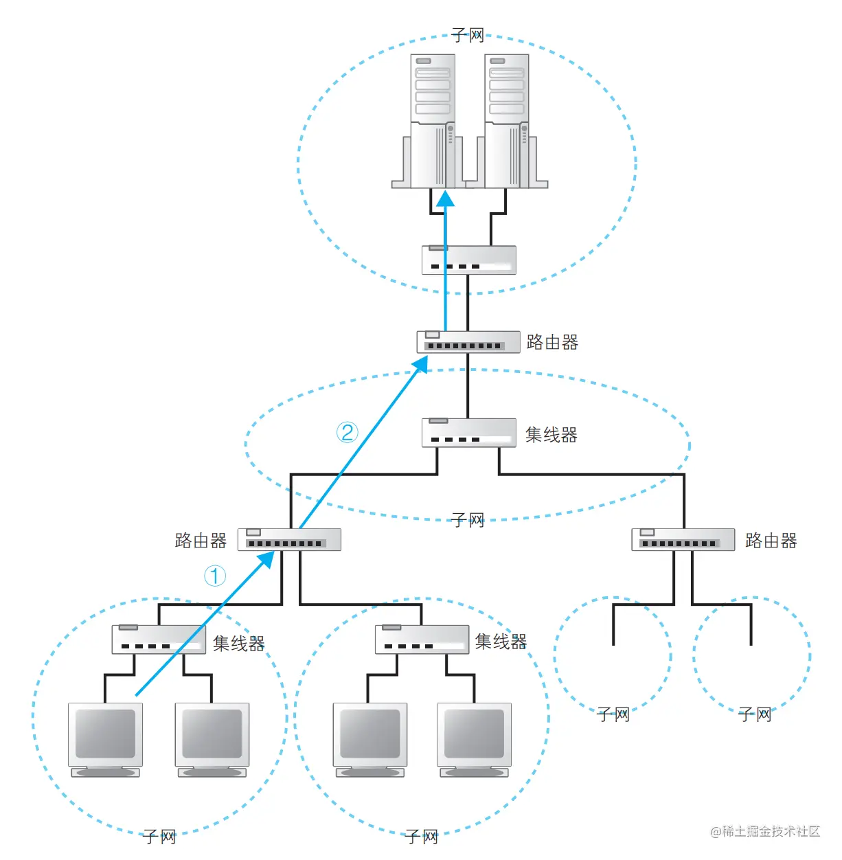 这里的子网可以理解为用集线器连接起来的几台计算机,然后将子网通过路由器连接起来,就形成了一个网络。