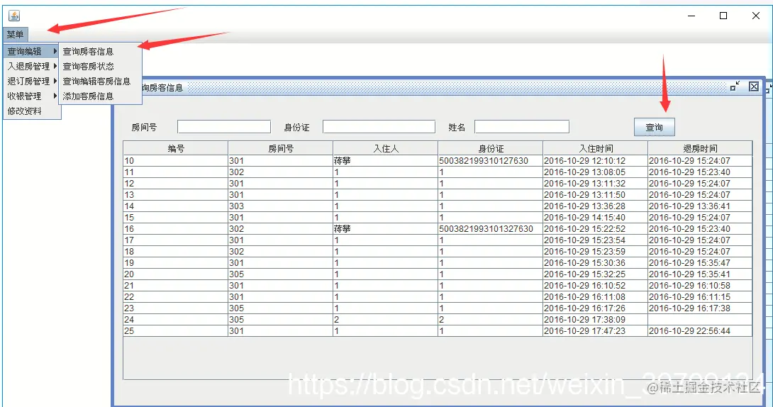 查询房客信息列表数据、也可以根据房间号、身份证以及姓名等信息进行模糊查询
