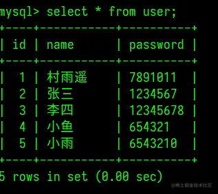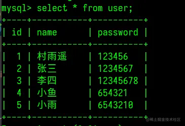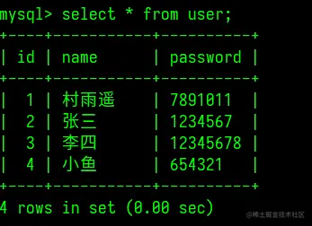 INSERT INTO user (id, name, password) VALUES (1, '村雨遥', '123456'),(2, '张三', '1234567'),(3, '李四', '12345678');