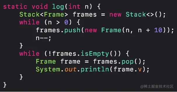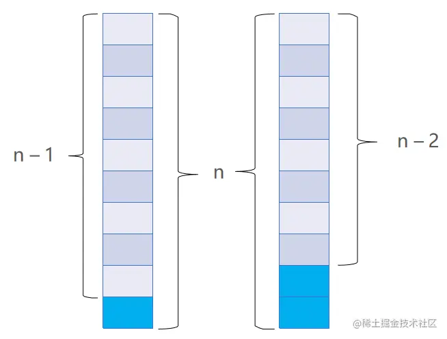 这里重复使用变量 i 保存原来栈帧中的参数;空间复杂度从 O n 降到了 O 1