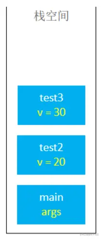先从main函数进入(main进栈),在执行test1函数(test1进栈),test1函数执行完毕之后(test1出栈),执行test2函数(test2进栈),执行test3函数(test3进栈); test3函数执行完毕(test3出栈),test2函数执行完毕(test2出栈),main函数执行结束(main出栈)