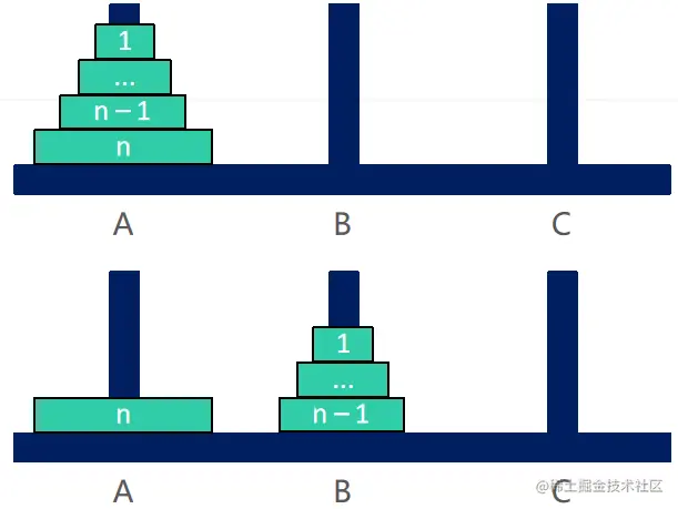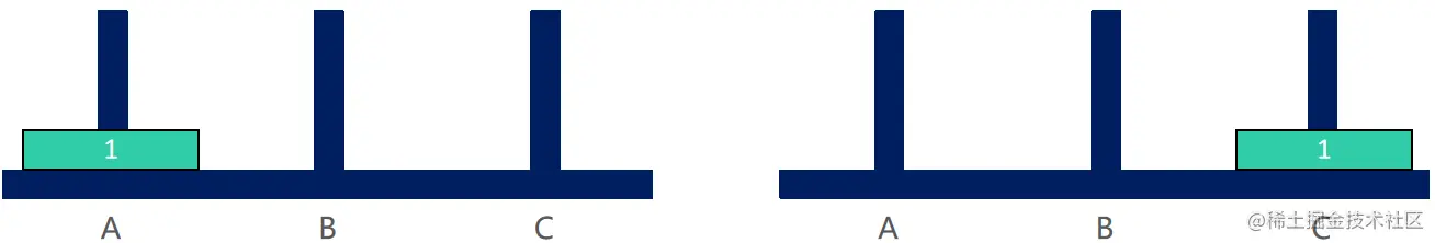当 n == 1时,直接将盘子从 A 移动到 C
