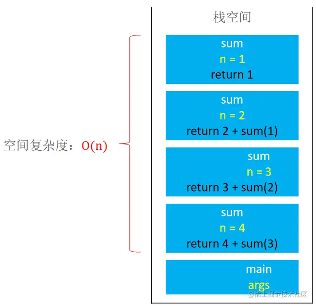 递归调用的空间复杂度 = 递归深度 * 每次调用所需的辅助空间