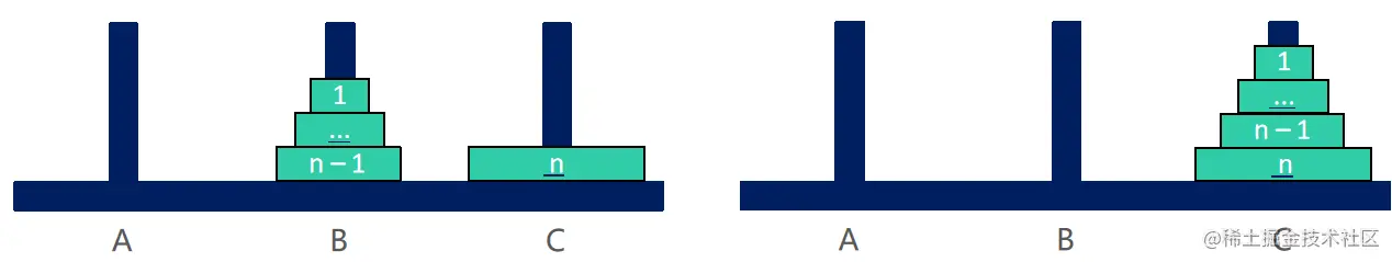 ② 将编号为 n 的盘子从 A 移动到 C