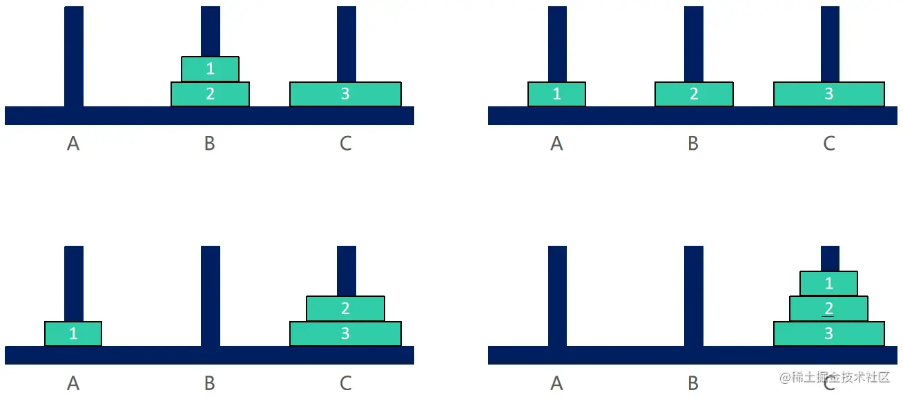 ③ 将 n – 1 个盘子从 B 移动到 C