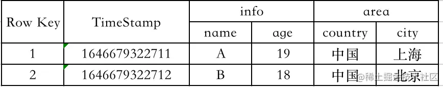 Row key 是主键,按照字典序排序。TimeStamp 是版本号。info 和 area 都是列簇(column Family),列簇将表进行横向切割。name、age 叫做列,属于某一个列簇,可进行动态添加。Cell 是具体的 Value 。