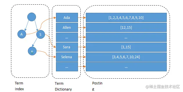 图中的 Ada、Sara 被称作 term,其实就是分词后的词了。如果把图中的 Term Index 去掉,是不是有点像 MySQL 了?Term Dictionary 就像二级索引,但 MySQL 是保存在磁盘上的,检索一个 term 需要若干次的 random access 磁盘操作。