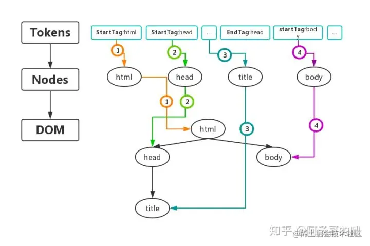 开始标签,结束标签,将Tokens之间相互串联起来。生成Nodes(对象节点)并构建DOM树。事实上,在构建DOM树时,不是要等所有的Tokens都转换成Nodes后才开始,而是一边生成Token一边采取
