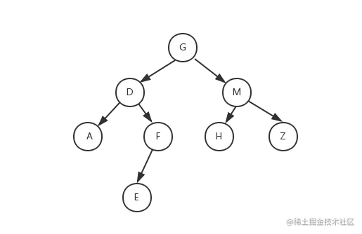 访问顺序:先根节点,再左子树,最后右子树;上图的访问结果为:GDAFEMHZ。