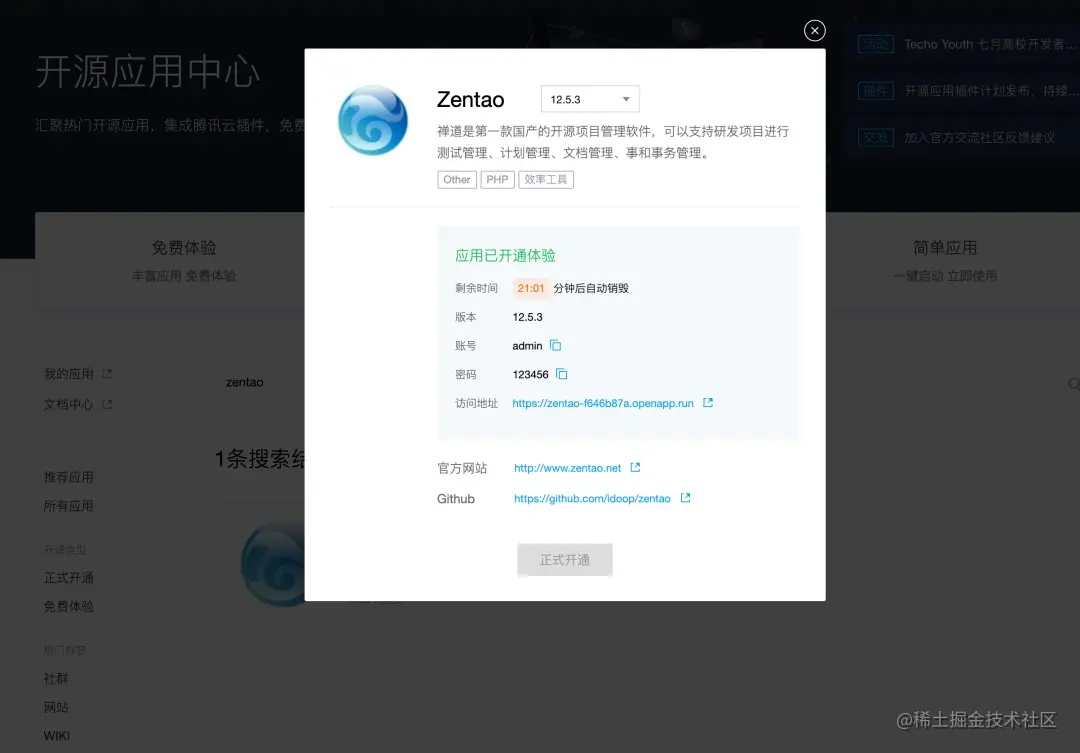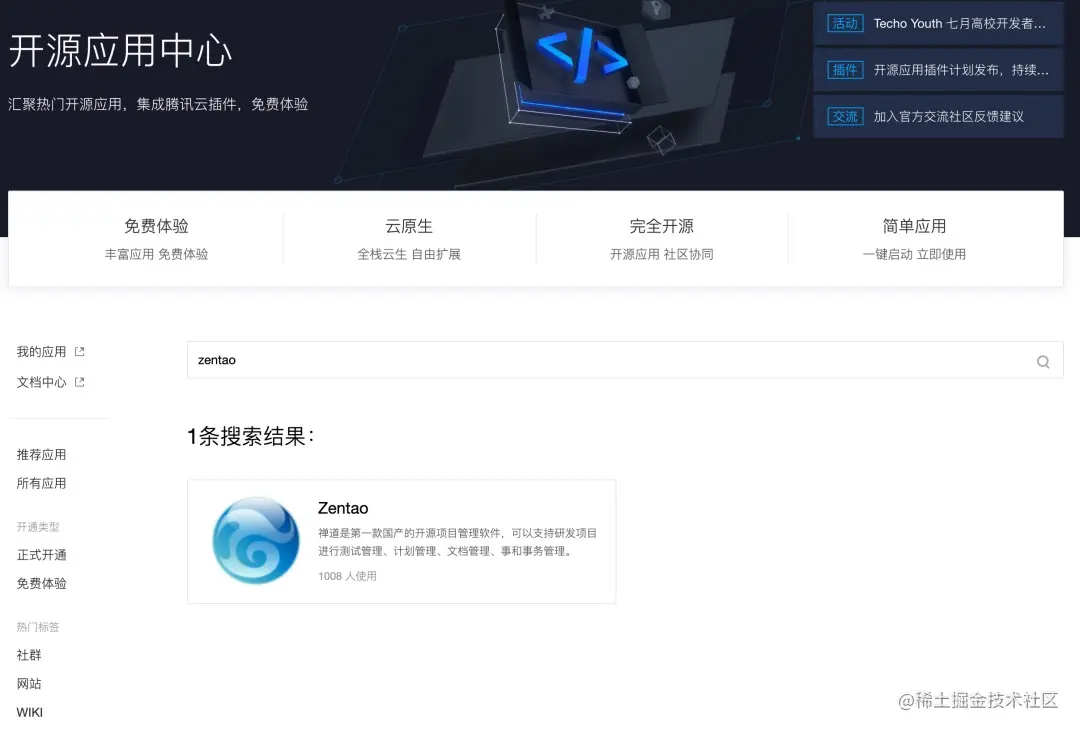第一步:登录腾讯云开源应用中心,搜索Zentao应用