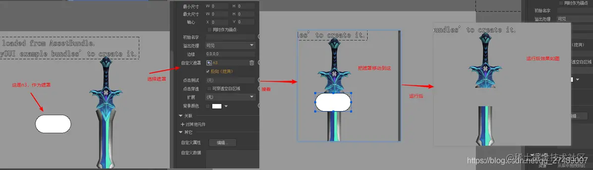 使用图片(Image)作为遮罩时,图片内透明度为0的像素对应区域的内容可见,反之不可见。超出图片区域的内容可见。