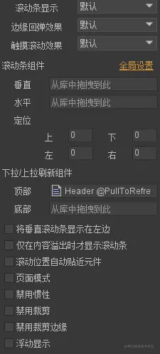- 触摸滚动效果 是否允许用户直接拖拽滚动区域内的内容。一般在移动平台上使用,PC上较少,PC上一般需要拖动滚动条,或使用鼠标滚轮。